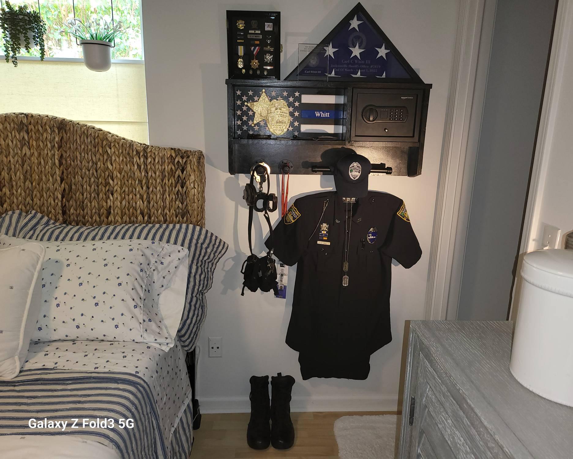*Note: Flags/racks will have small blemishes due to the nature and character of the wood. This is a handmade wood product, and every piece of wood is unique in its knots and texture. All sizes are approximate and may vary by half an inch. The lightness/darkness of the stain can differ based on how the wood takes the stain and lighting conditions. **We highly recommend creating a key passcode upon receiving the rack with a safe and